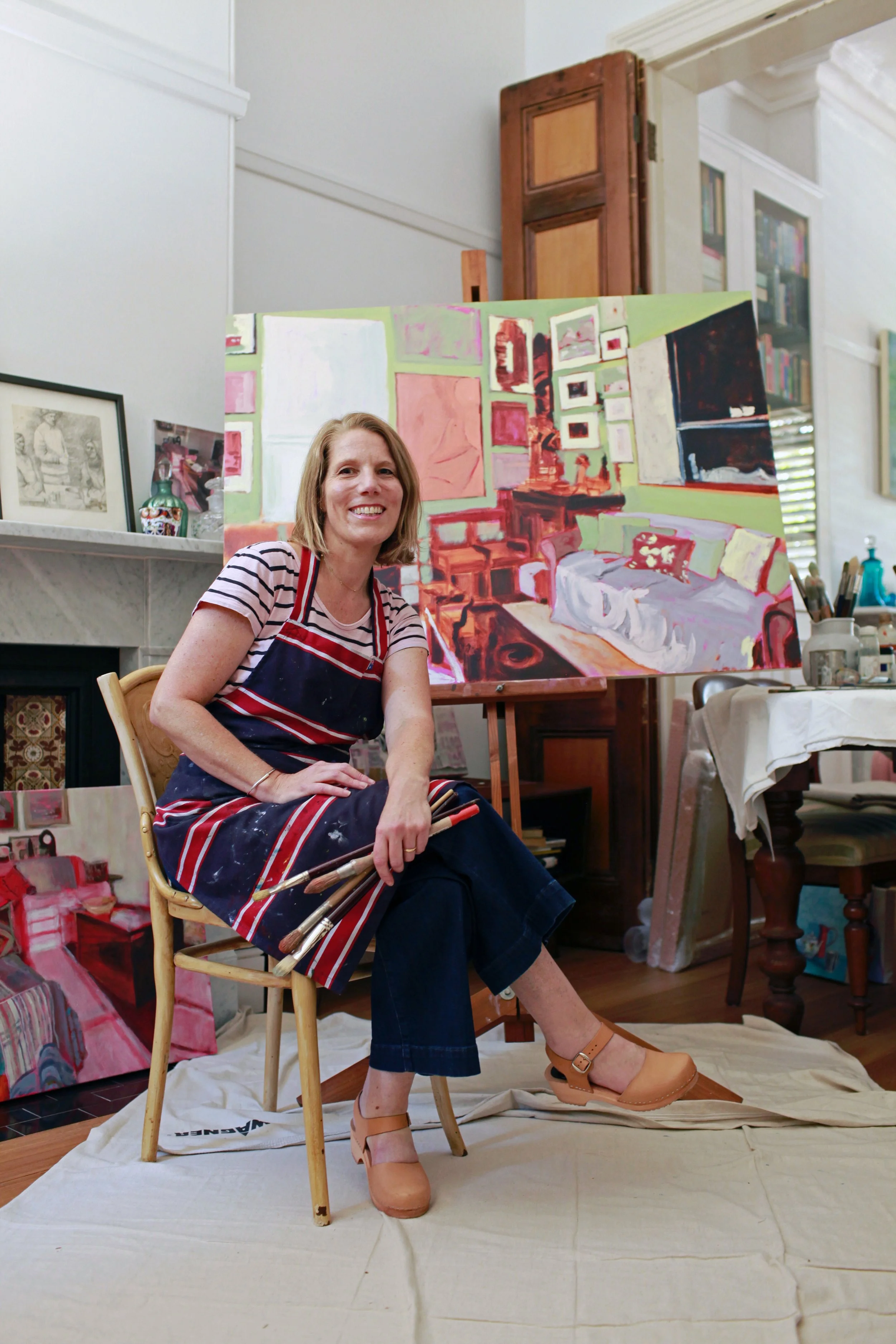 Both Sue’s interior and still life works embody the sacredness of objects; attaching meaning and relationships to the things we hold dear, conjuring memories of people, places and time. Sue works mostly in oils.